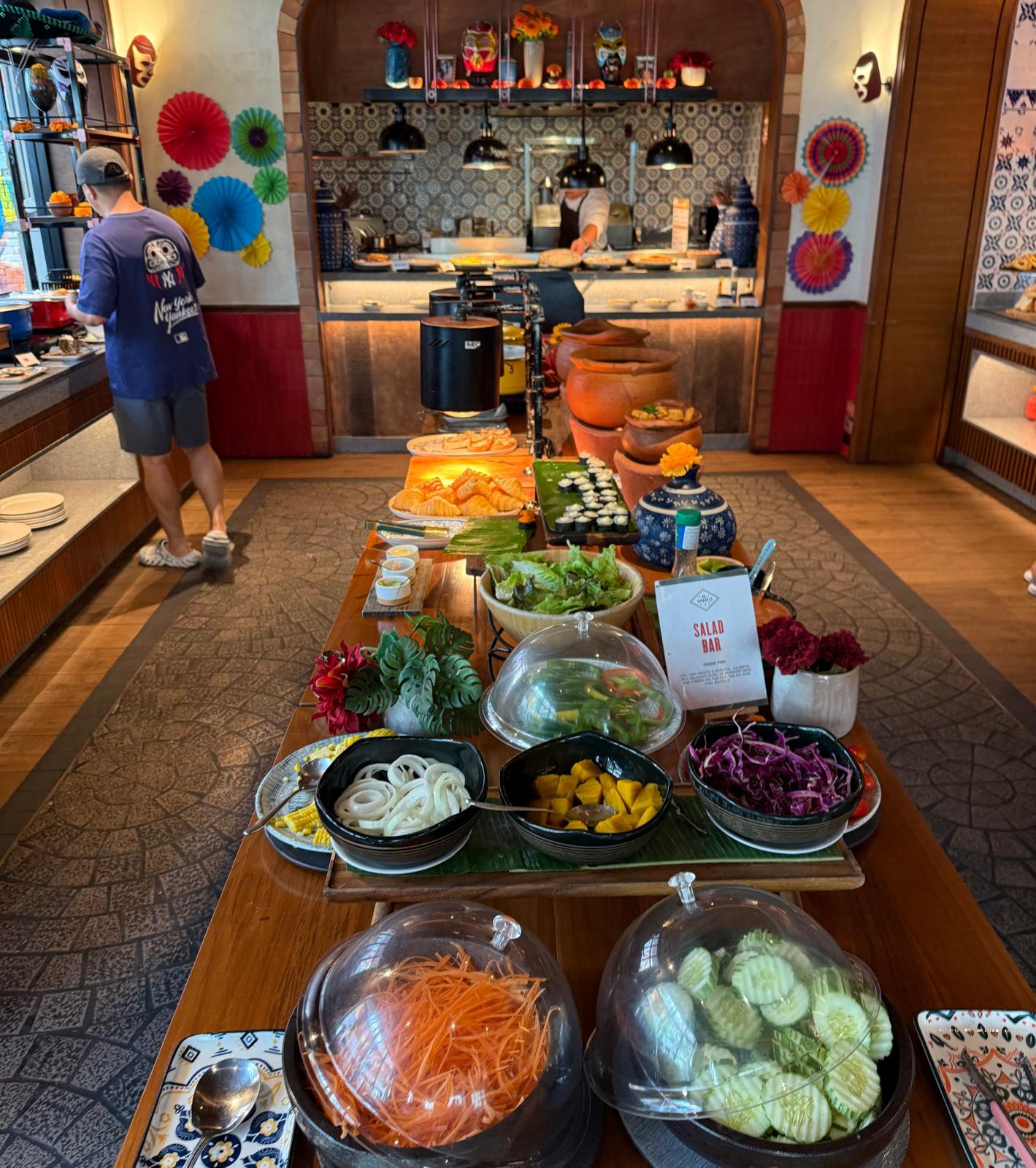 BUFFET Y RESTAURANTE MEXICANO. El buffet nos impresionó. No sólo por lo completo que es y la gran variedad de comida distinta que tiene, sino por la calidad de todo. Desde comida asiática a una completa oferta de platos salados y dulces, zumos, frutas… Además el local es por la noche un restaurante mexicano perfecto para cenar algo cuando llegas cansado después de un intenso día de visitas.