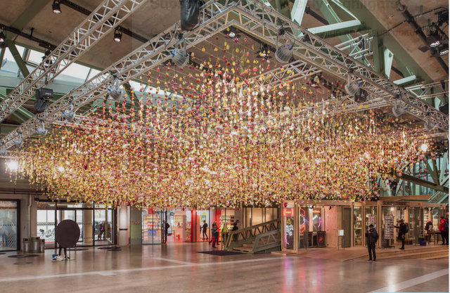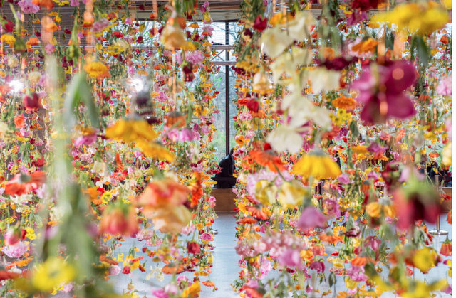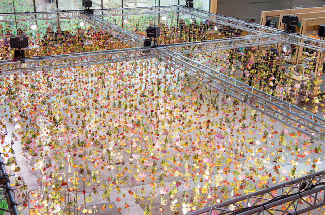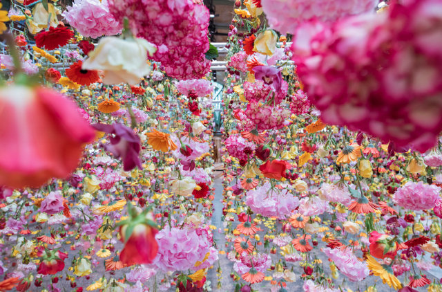 Es una forma preciosa de dar la bienvenida a la primavera: colgar miles flores desde el techo que parecen casi una «alfombra volando» de colores y olores: 30 mil flores vivas por encima de las cabezas de los visitantes. Una auténtica delicia para todo los que tengan la suerte de visitar este centro comercial, el Bikini en Berlin.