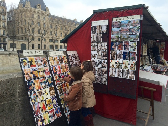 PERDERSE CAMINANDO POR LAS ORILLAS DEL SENA Y SUS PUESTOS. Posters, libros, posavasos, comics… Es otra de las imágenes con más encanto de París. Los puestecillos de libros y recuerdos a ambos lados del río Sena. A mis hijos les encantó descubrir lo que había en cada puesto… compramos regalitos para los primos y eso tan simple fue uno de los mejores momentos del día: perderse entre libros antiguos con Notre Dame enfrente.